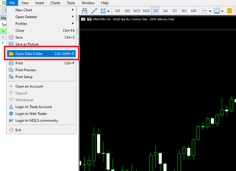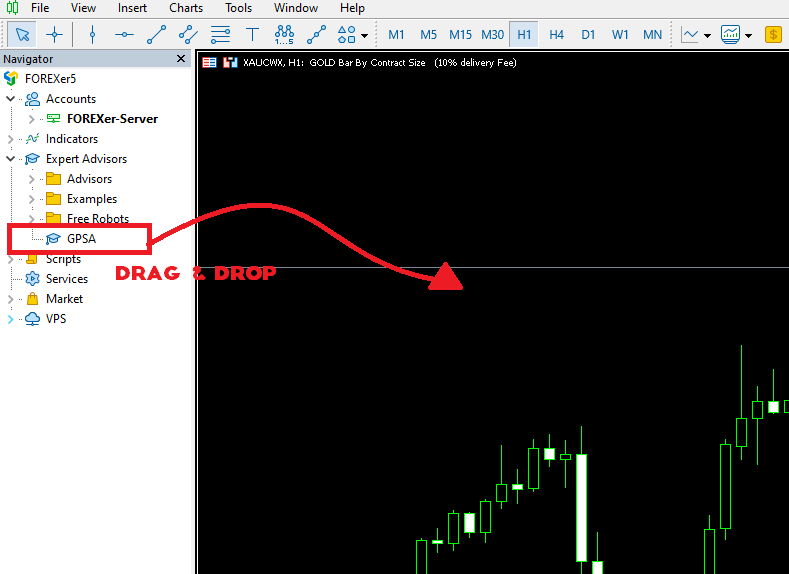 از Navigator، EA را روی چارت مورد نظر (XAUCWX) بکشید و رها کنید.