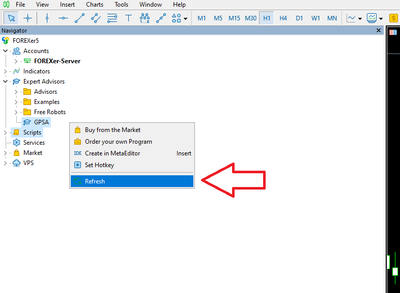 در پنجره Navigator روی Experts راستکلیک کرده و Refresh را انتخاب کنید.