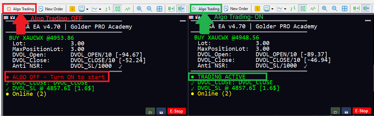 دکمه Algo Trading در نوار ابزار MT5 را فعال کنید (باید سبز شود).