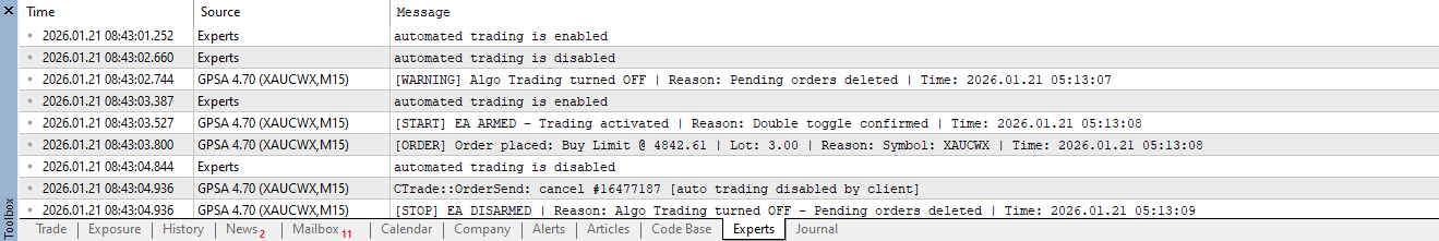 اگر ۳ سفارش یا بیشتر در ۶۰ ثانیه ثبت شود، EA برای ایمنی متوقف میشود.