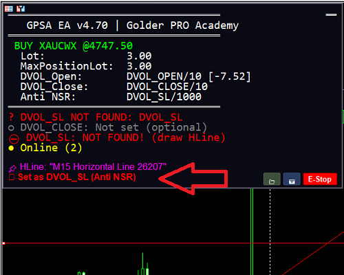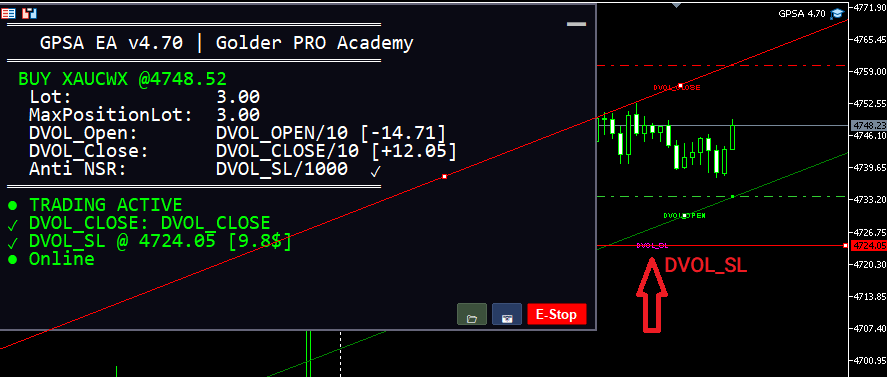 با رسم خط جدید، دکمههای تنظیم DVOL_OPEN/CLOSE/SL نمایش داده میشود.