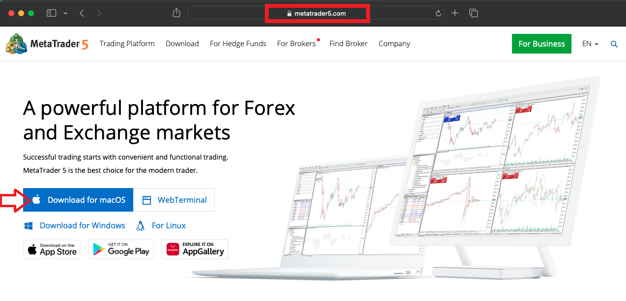 - برای دانلود نرم افزار، وارد سایت رسمی متاتریدر به نشانی https://www.metatrader5.com شده و گزینه Download for macOS انتخاب میشود.