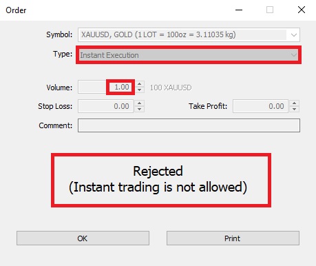 - نکته ۲: معامله گر در حساب GMpFA پس از انتخاب گزینه معامله فوری (Instant Execution) در صورت خرید و یا فروش با عنوان "Rejected" مواجه خواهد شد.(شکل۱)
