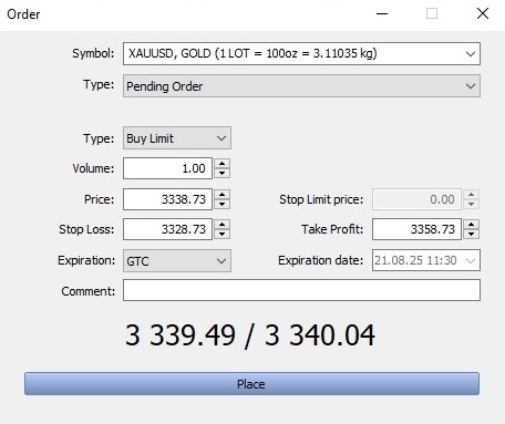 - مثال: اگر جفت ارز XAU/USD در حال حاضر ۳۳۳۹.۴۹ معامله میشود (شکل۲) و معاملهگر پیشبینی میکند که قیمت (price) به ۳۳۳۸.۷۳ کاهش یافته و سپس افزایش مییابد، بنابراین، سفارش محدود خرید را در ۳۳۳۸.۷۳ قرار میدهد (شکل۳). در حساب معاملاتی GMpFA - سفارش محدود خرید در این مثال: