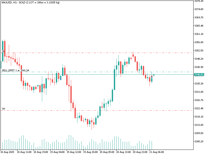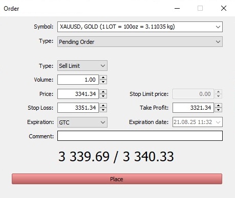 - مثال: اگر جفت ارز XAU/USD در حال حاضر ۳۳۳۹.۶۹ معامله میشود (شکل۴) و معاملهگر پیشبینی میکند که قیمت به ۳۳۴۱.۳۴ افزایش یافته و سپس کاهش مییابد بنابراین، سفارش محدود فروش را در ۳۳۴۱.۳۴ قرار میدهد (شکل۵). در حساب معاملاتی GMpFA - سفارش محدود خرید در این مثال: