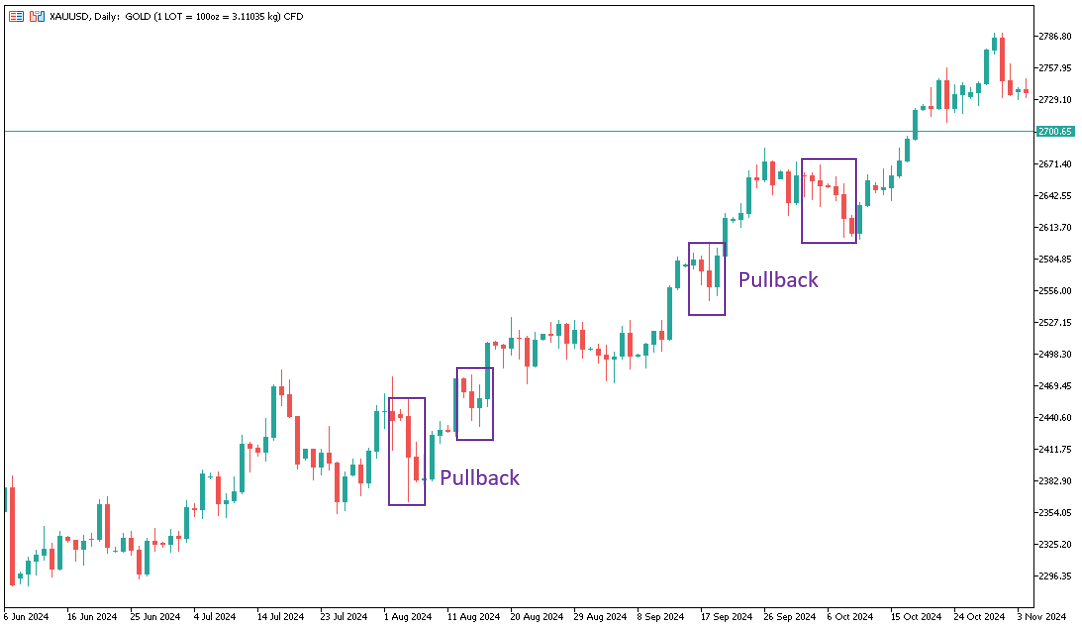 - پولبک در روند صعودی: اگر قیمت پس از یک افزایش قابلتوجه برای مدت کوتاهی کاهش یابد و مجدد رشد کند و به روند اصلی خود بازگردد، این حرکت نزولی موقتی بهعنوان پولبک شناخته میشود.